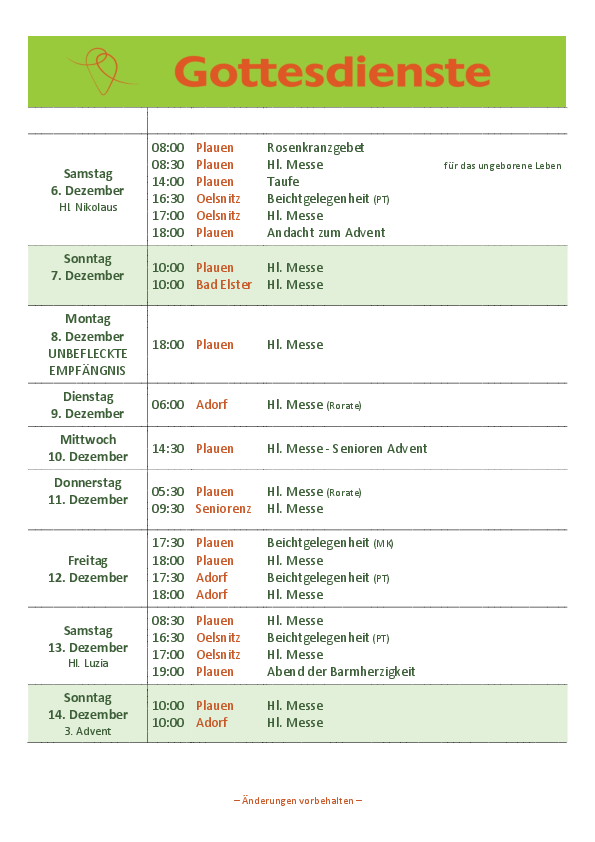| Sonntag | 10.00 Uhr 10.00 Uhr 11.00-18.00 Uhr | Plauen: Königszeit - Eucharistische Anbetung |