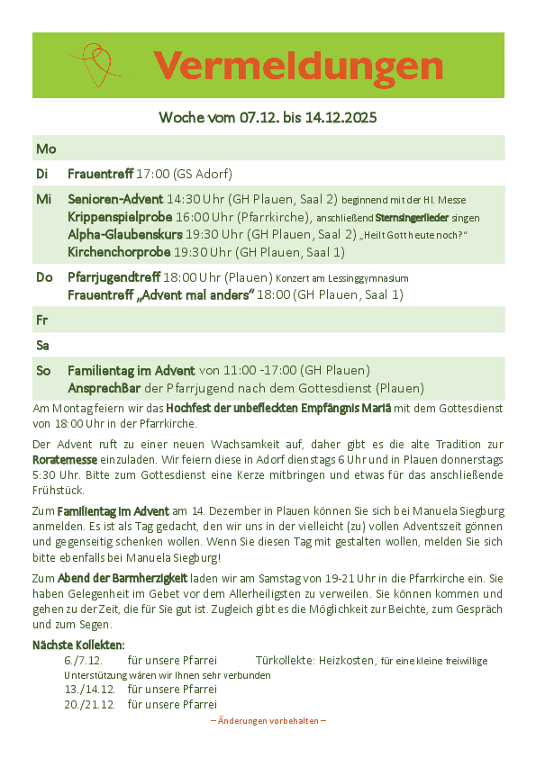 | Samstag | 17.00 Uhr 17.00-21.00 Uhr | Adorf: Königszeit - Eucharistische Anbetung |