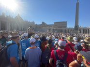 Anschließend ist Zeit für ein bisschen Sightseeing und Mittagessen, bevor wir zum Petersplatz gehen, um zur Audienz mit Papst Franziskus zu gelangen. Dort heißt es wieder warten (aber das können wir seit Montag ja gut) und die Sicherheitskontrollen absolvieren. Kaum auf dem Petersplatz angekommen, geht es ganz schnell und die Nachricht macht die Runde: "Der Zugang zum Platz ist geschlossen, der Papst kommt gleich." Und schon wieder ist unsere Geduld gefordert, denn bei der großen Runde über den Petersplatz kommt der Papst erst ganz zum Schluss bei uns vorbei. Die Freude über das besondere Erlebnis, Franziskus einmal "in echt" zu sehen, ist dennoch groß. Einige Minis unseres Bistums haben sogar die Gelegenheit, während der Adienz auf dem Sagrato, dem treppenartigen Vorplatz des Petersdomes zu sitzen und im Anschluss dem Papst die Hand zu schütteln.