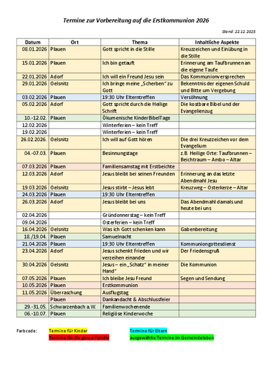 Hinweis: Die grau unterlegten Termine gehören nicht im engeren Sinne zur Kommunionvorbereitung. Wir empfehlen aber eine Teilnahme, um in Kontakt zu andern Familien in der Pfarrei zu kommen.